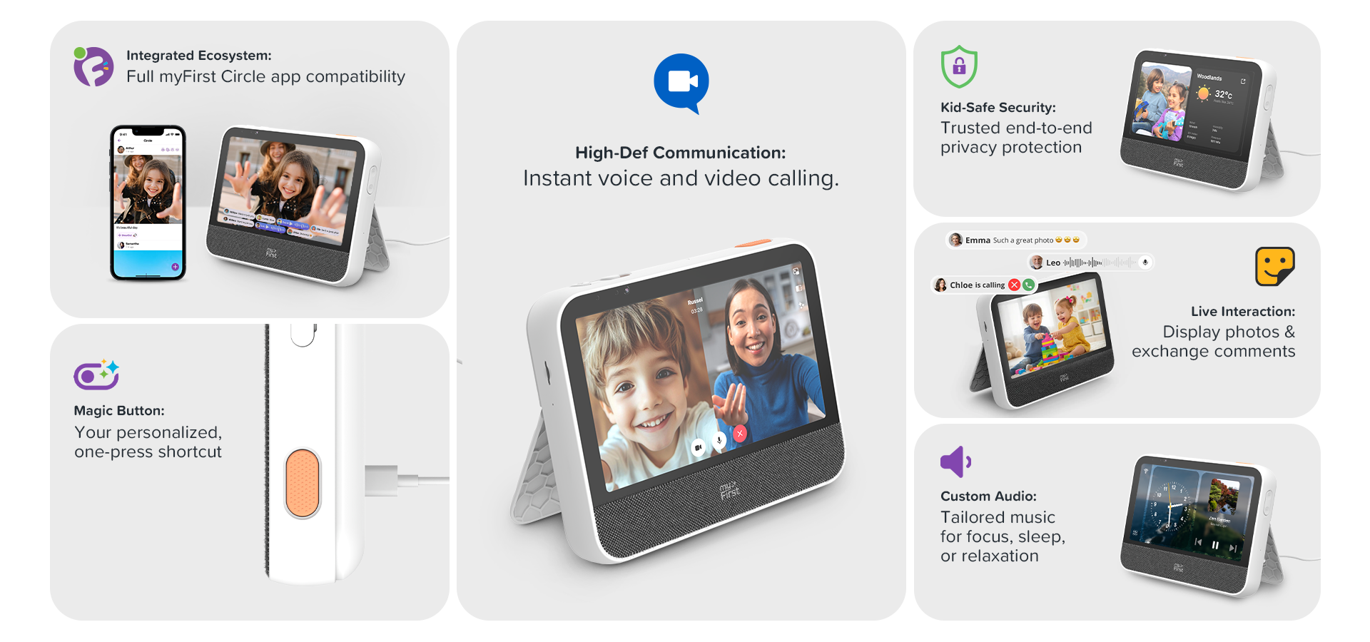 Connect the myFirst Camera 50 for instant photo sharing and the myFirst Fone for safe, high-definition video calls directly to the frame.